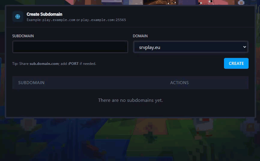 Creating a custom subdomain IP address is a great method for players to remember the IP address of your server and log in using it. QGS Hosting also provides custom domain options at affordable prices on a yearly basis - you can check them out HERE. Our control panel makes this process extremely easy to proceed, you need to follow these steps: