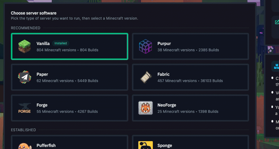 To make this easier, below you will find tables that group the available server platforms by their main use case. This will help you understand which versions are best for plugin-based servers and which are better for mod-based servers.